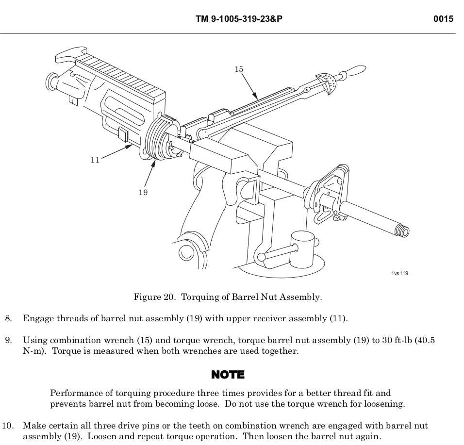 AR Barrel Nut 30 Ft. lbs. Minimum, not to exceed 80 Ft. Lbs. to align the next slot in the barrel nut. The 80 Ft. Lbs is not stated in the TM, but I don’t know how you would line up the gas tube, without going over 30 Ft. Lbs. Unless you use shims. I don’t think most folks will have any laying around. This torque spec is common across the community and internet.